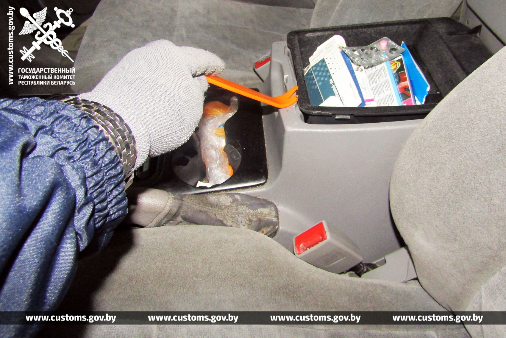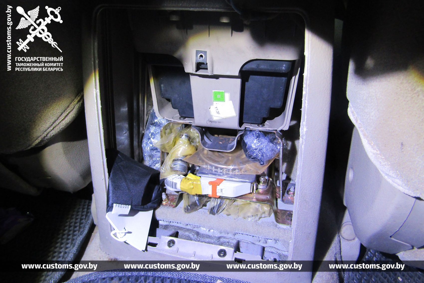 В результате обнаружены тайники с сокрытыми товарами - в подлокотнике между сидениями в одном авто, в нише за приборной панелью под рулевым колесом в другом.