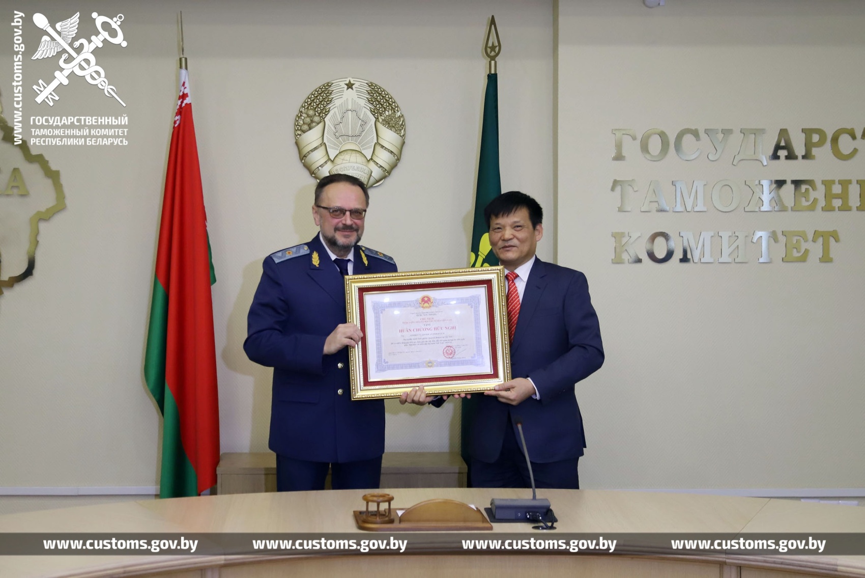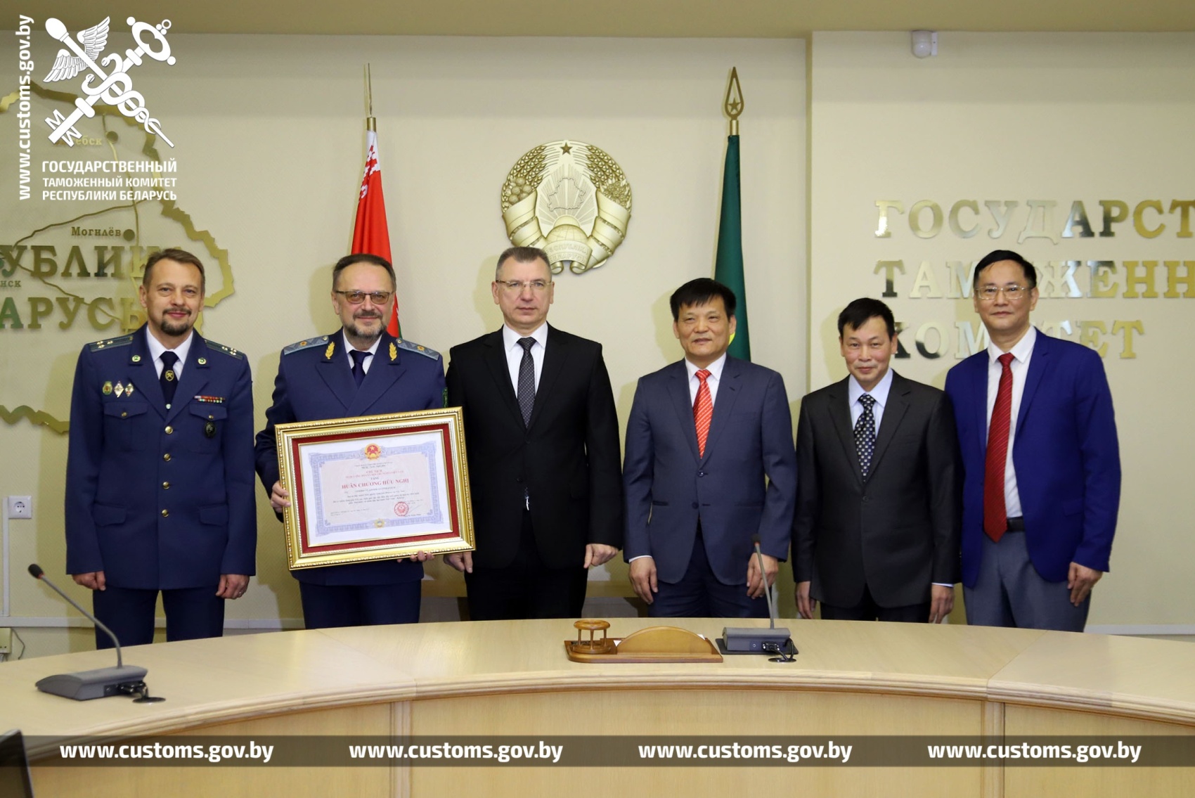 Еще один важный повод для встречи – вручение высокой государственной награды Социалистической Республики Вьетнам начальнику УО «Государственный институт повышения квалификации и переподготовки кадров таможенных органов» Владимиру Гошину, который ранее являлся Чрезвычайным и Полномочным Послом Республики Беларусь во Вьетнаме.